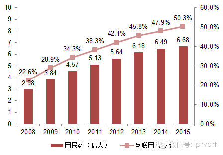 根据CNNIC数据,截至2015年12月,我国网民规模达6.68亿,互联网普及率为50.3%,较2014年底提升2.4个百分点。2015年新增加的网民群体中,低龄(19岁以下)、学生群体的占比分别为46.1%、46.4%。