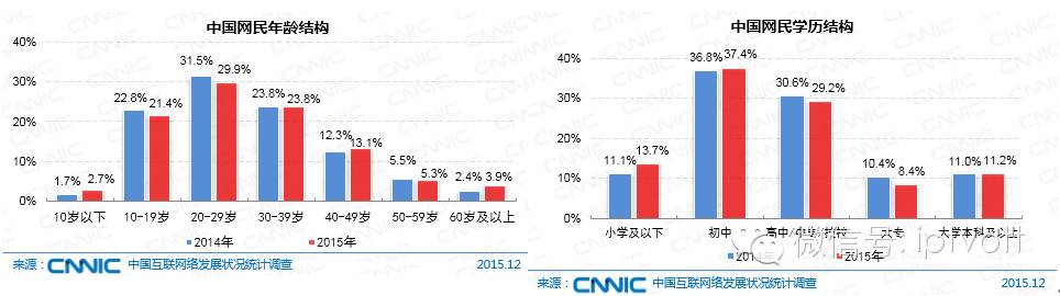 网民中具备中等教育程度的群体规模最大,初中、高中/中专/技校学历的网民占比分别为37.4%、29.2% 。与2014年底相比,小学及以下学历人群占比提升了2.6个百分点,中国网民继续向低学历人群扩散。
